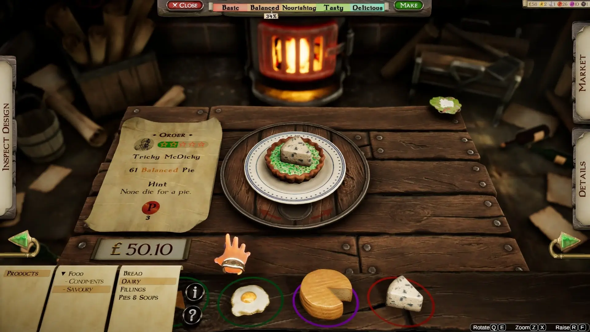 Основная экономика крутится вокруг заказов. Местные лорды, купцы и прочие типы присылают требования: «дай 61 сбалансированный пирог». А что такое «сбалансированный» — решать вам. В игре открываются ингредиенты: мясо крысы, курица, клубника, салат, сыр, ещё какая-то дрянь. Вы сами комбинируете начинку. Но есть подсказки. Например, один лорд просит пирог и добавляет: «Никто не умрёт ради пирога». Понятно — делаем вегетарианский. Кладём сыр с плесенью, салат, перец — готово.