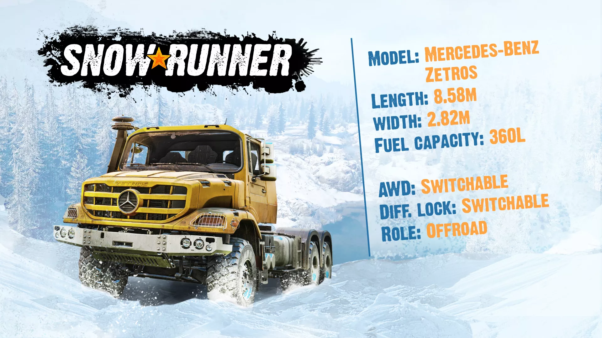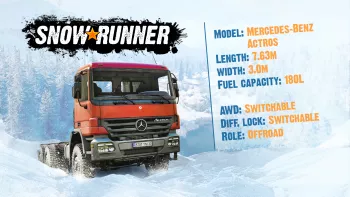 Mercedes-Benz Actros 3332: В отличие от Zetros, Actros изначально проектировался как «асфальтовый» тягач для перевозки грузов по шоссе. Однако в версии для Snowrunner он получил соответствующую резину с глубоким протектором, что делает его интересным вариантом для эксплуатации на гравии и грунте.