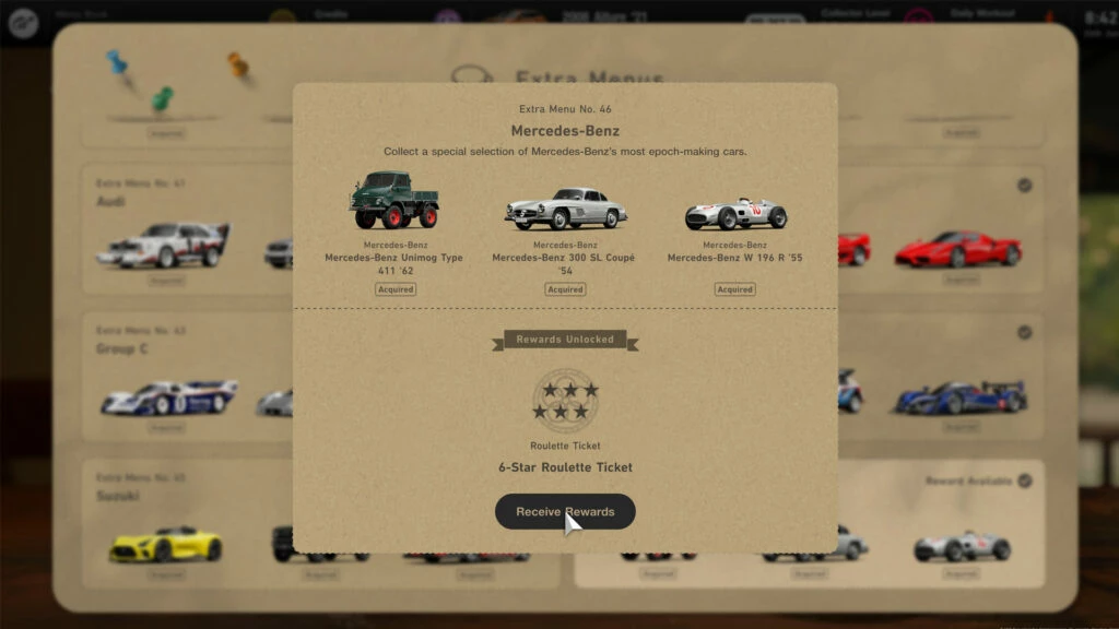 Для коллекционеров подготовили задание, связанное с Mercedes-Benz. Чтобы получить специальный приз, нужно собрать три конкретные модели этого бренда — от легендарного 300 SL до гоночного W 196 R.