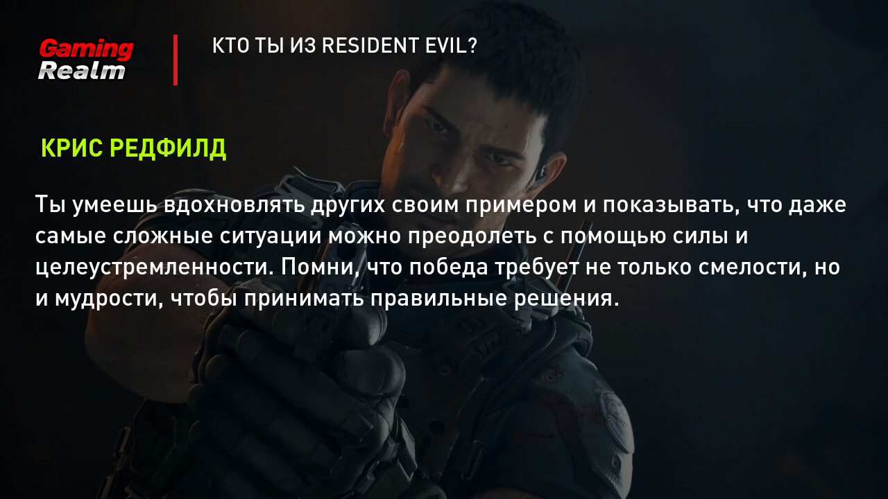 Ты готов вступить в мир приключений, тайн и страшных угроз? Resident Evil ждет тебя! Пора узнать, каким из ключевых персонажей серии ты больше всего похож: бесстрашным воином Крисом Редфилдом, целеустремленной профессионалкой Джилл Валентайн, харизматичным героем-одиночкой Леоном Скотт Кеннедиили отважной учёной Ребеккой Чемберс.